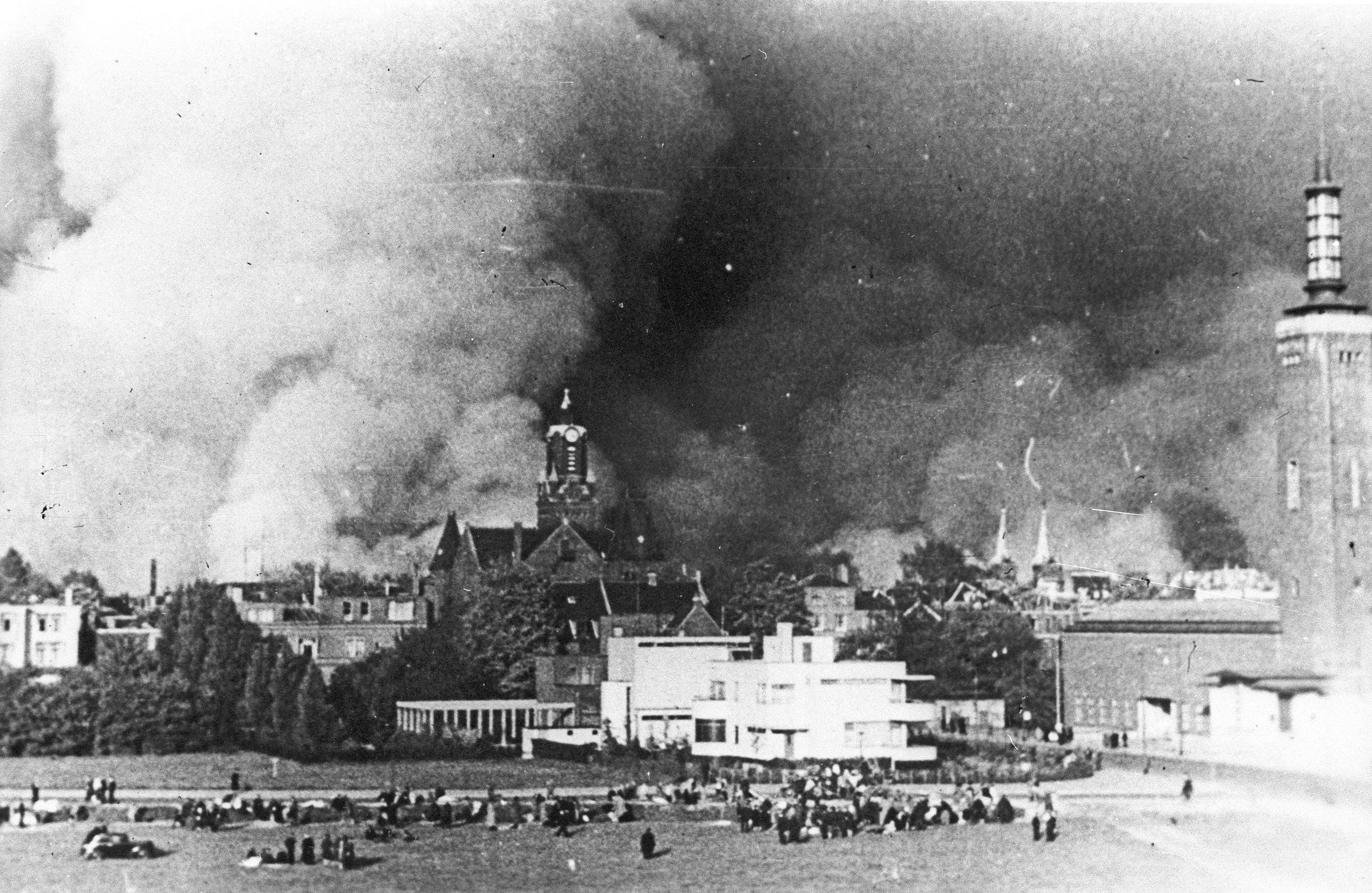 Gezicht op de door het Duitse bombardement getroffen binnenstad van Rotterdam, gezien vanaf het Land van Hoboken (met rechts Museum Boymans), 14 mei 1940. Bron: Stadsarchief Rotterdam, doc.nr. 4100_2001-5372 .