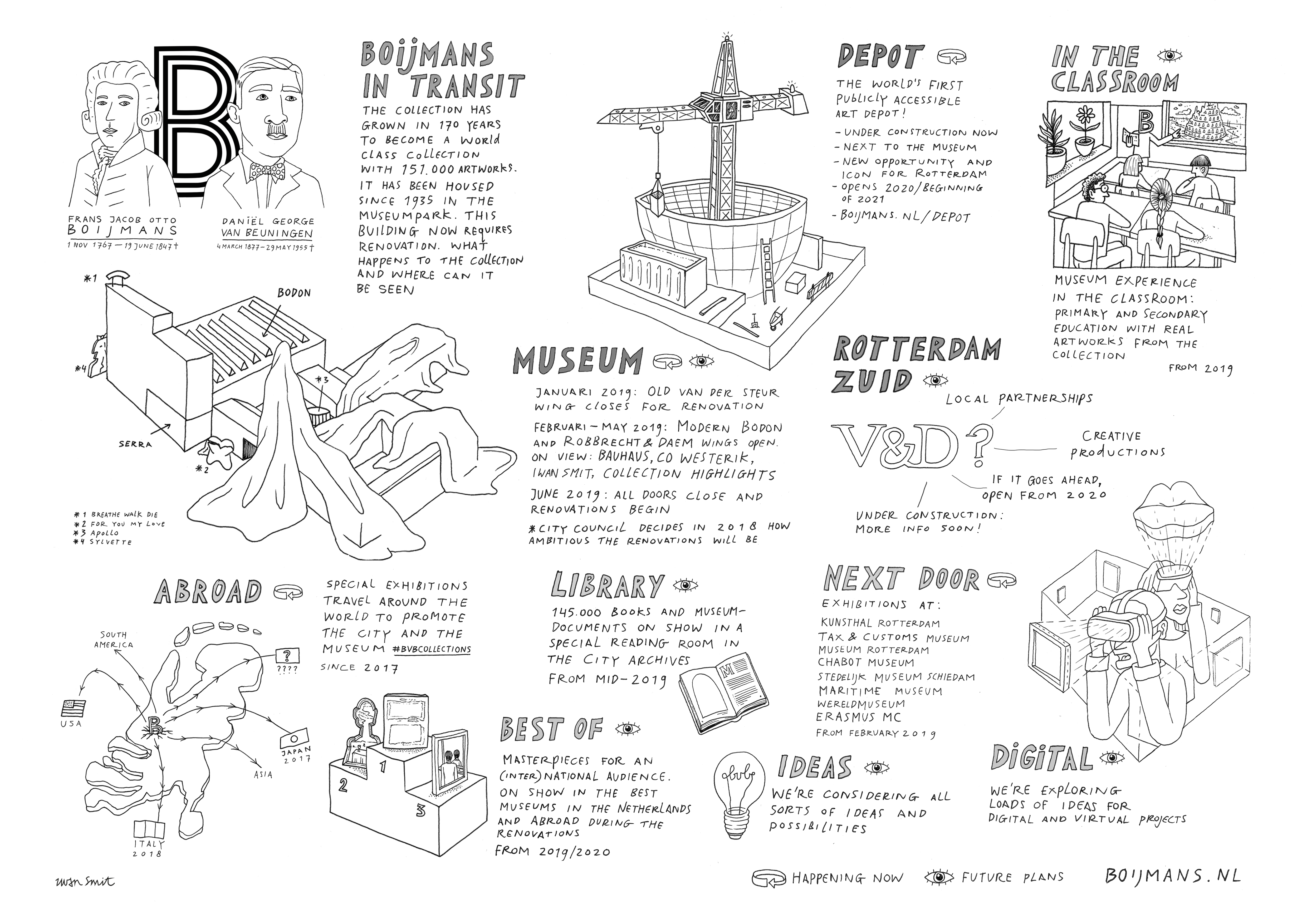 During the renovations, a large part of the collection will remain accessible to the public. Seven neighbouring museums will make exhibitions under the name ‘Boijmans Next Door’, partially made possible by Stichting Droom en Daad. Masterpieces from the collection will continue to be seen abroad in the form of special travelling exhibitions. For example, an exhibition entitled ‘The Best of Boijmans’ is planned to visit leading museums around the world. The museum’s collection of books will be transferred to the Rotterdam City Archives. Under the name ‘Boijmans in the Classroom’, we are preparing an exhibition programme for Rotterdam’s schools in which real artworks play a role. We are working hard on a location in Rotterdam Zuid, where we plan to open an experimental space for young visitors in 2020. And finally, the construction of the Boijmans Van Beuningen Depot is in full swing. This iconic building and the world’s first publicly accessible art storage facility will open its doors in the Museumpark in 2021.