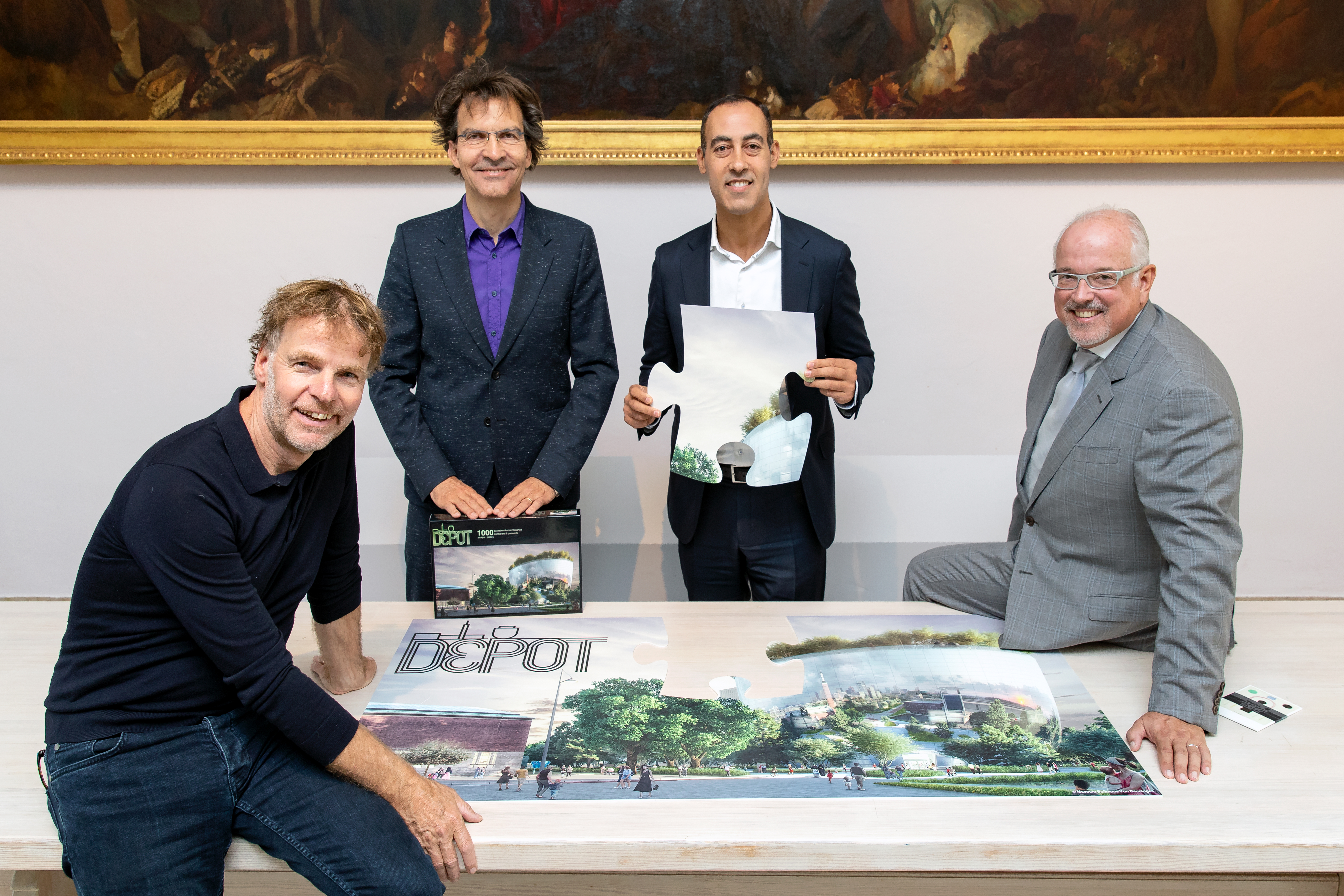 Winy Maas, Sjarel Ex, Said Kasmi en Roelof Prins met de Depot puzzel. Foto: Aad Hoogendoorn.