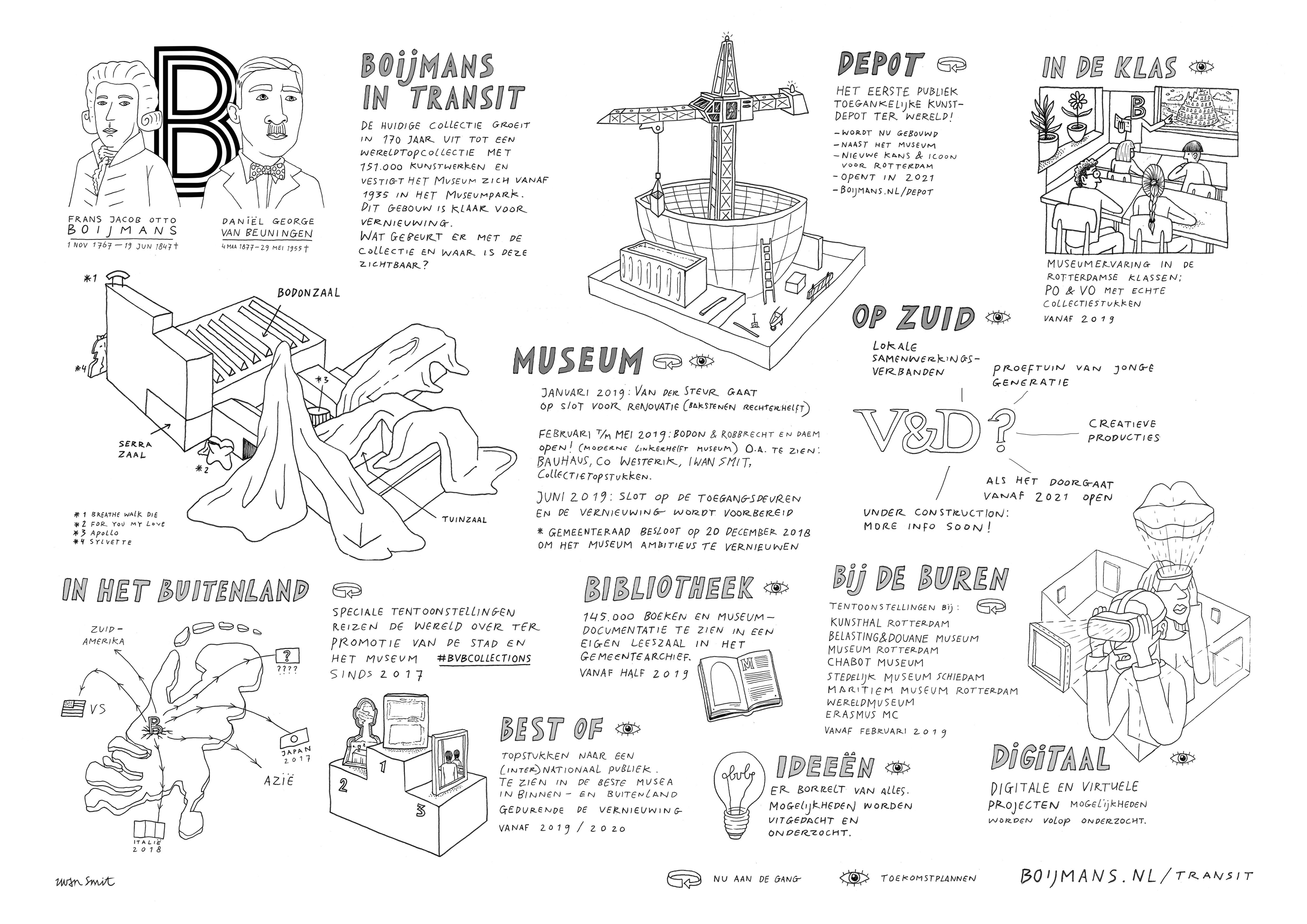 Vanaf 2019 gaat het museum zijn fase van noodzakelijke renovatie in. In die Transit-periode trekt het museum de stad Rotterdam en de wereld in om publiek te raken met zijn internationale topcollectie. Dat gebeurt vanaf 27 mei 2019 als het museumgebouw sluit voor de vernieuwing. Acht buurlocaties in de stad gaan een unieke samenwerking aan onder de noemer Boijmans bij de Buren. In elf verrassende tentoonstellingen blijven zo uiteenlopende collectiestukken te bezoeken. Boijmans opereert daarnaast in het buitenland, met reizende tentoonstellingen. Vanaf schooljaar 2019 maakt het museum Rotterdamse scholieren bekend met échte collectiestukken met Boijmans in de Klas. Droom is een locatie ‘op Zuid’, een proeftuin voor de jonge generatie, waaraan nog wordt gewerkt. Ondertussen vordert de bouw van Depot Boijmans Van Beuningen, het eerste publiek toegankelijke kunstdepot ter wereld dat in najaar 2021 opent en waar de 151.000 kunstwerken worden getoond en verzorgd.