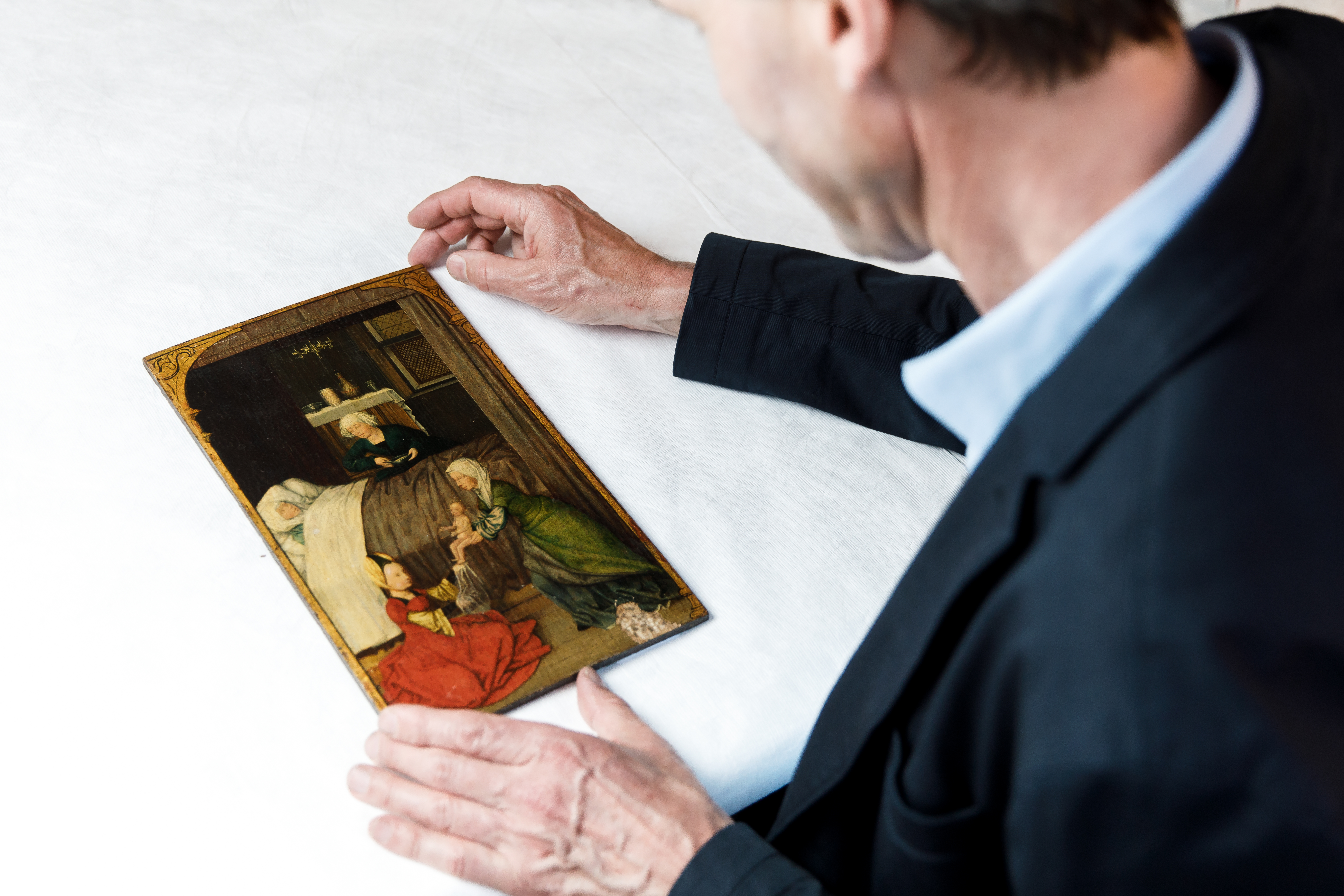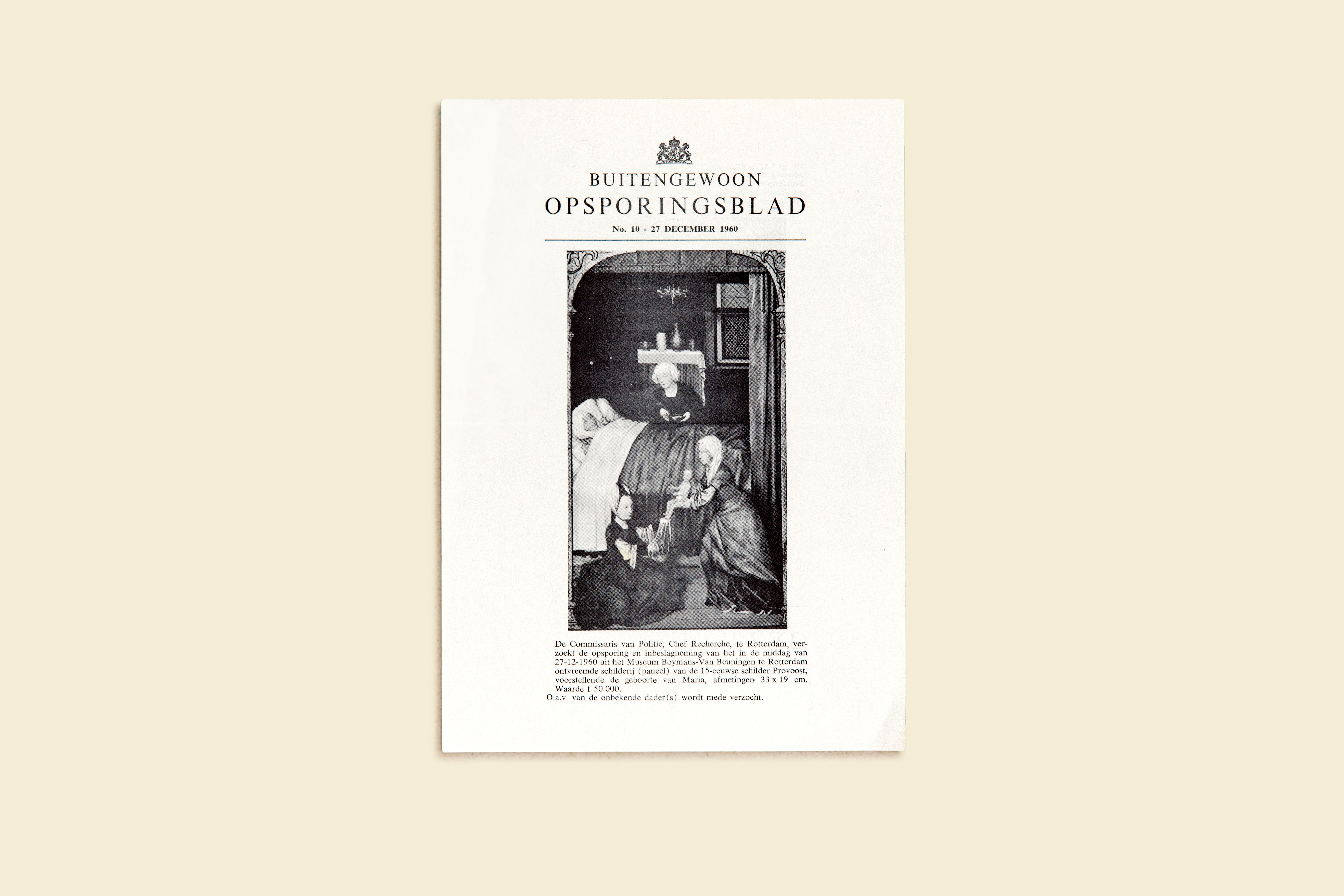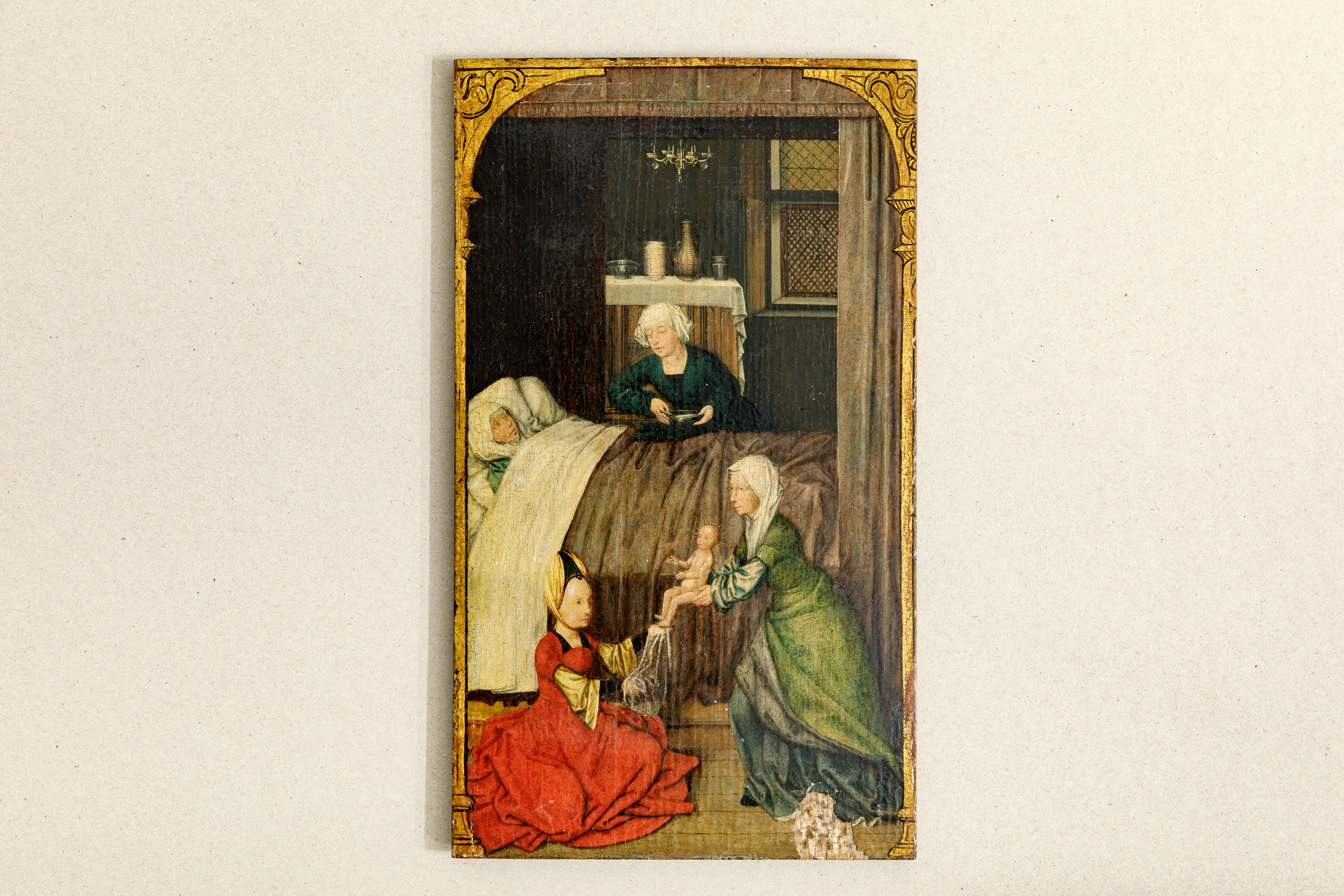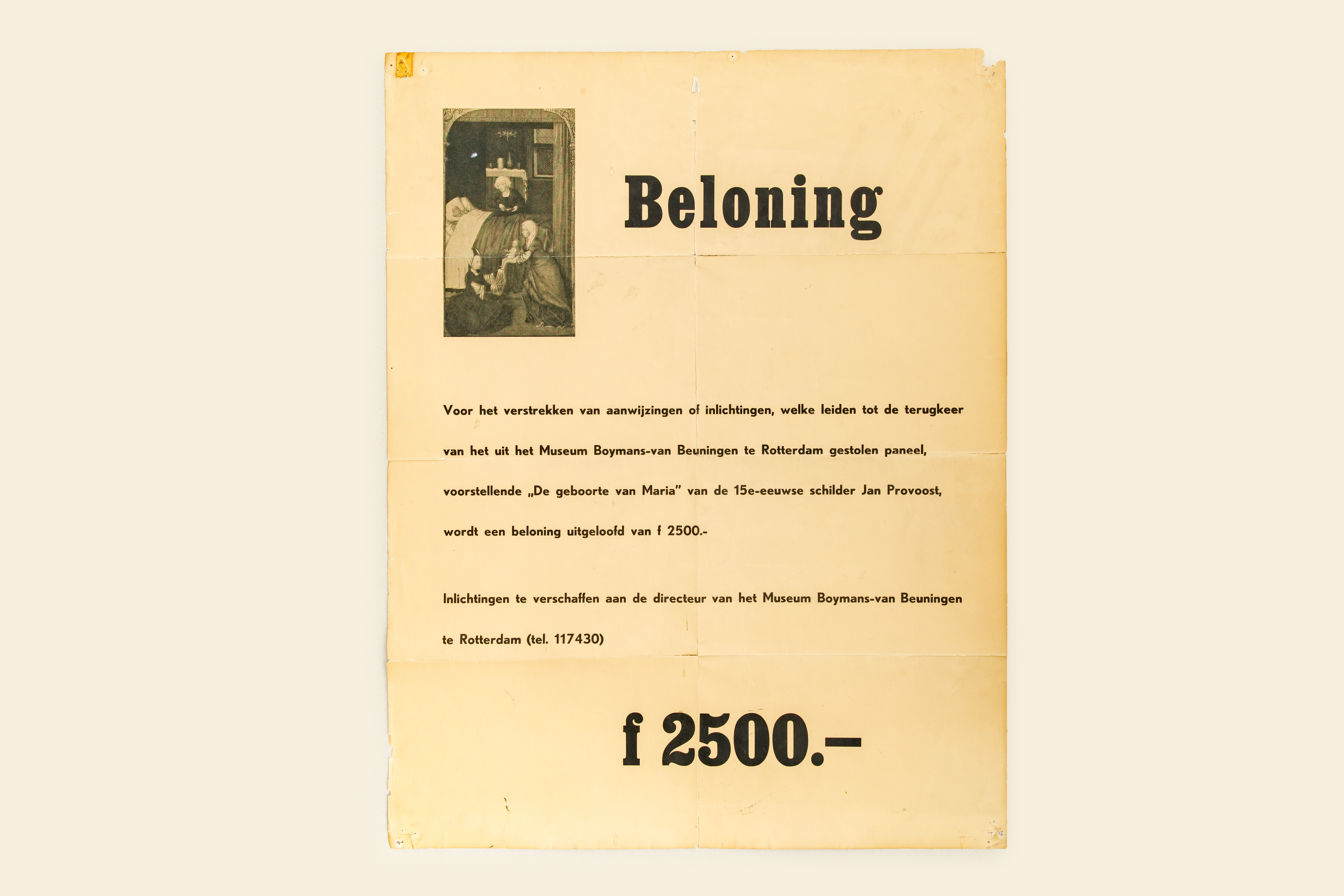 Een vijftiende-eeuws paneeltje (van ca. 33 x 19 cm) met ‘De geboorte van Maria’ werd op 27 december 1960 op klaarlichte dag tijdens een lunchpauze van de beveiliger uit Museum Boijmans Van Beuningen gestolen. Dankzij een tip van een oplettende Duitse verzamelaar die het werk in de catalogus voor een veiling in Bonn tegenkwam, kon het schilderij deze week terugkeren naar het museum.