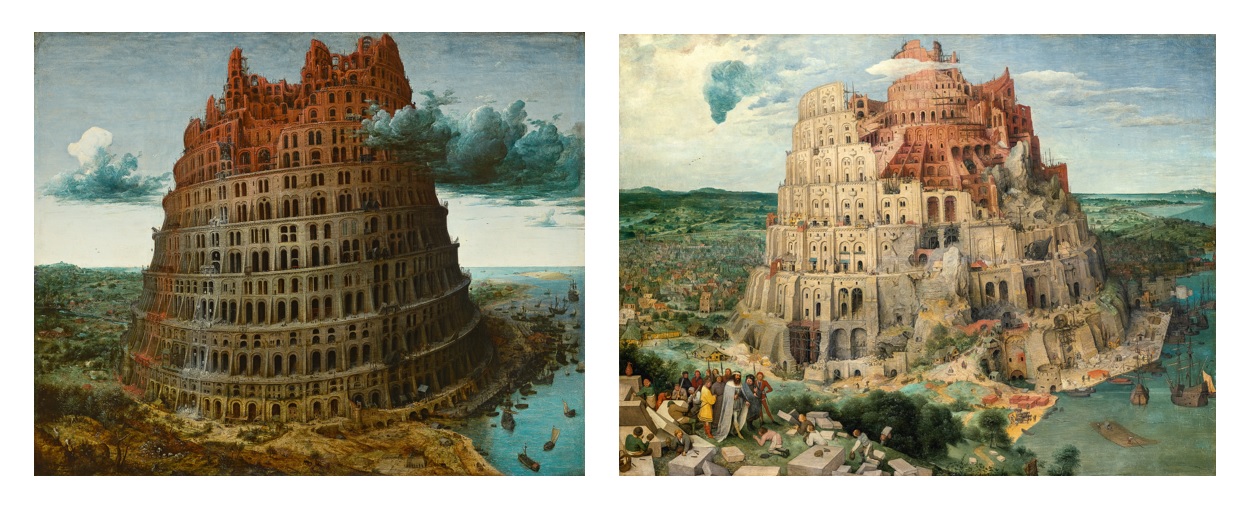 Pieter Bruegel's Towers of Babel side by side; on the left, the painting of Museum Boijmans van Beuningen.