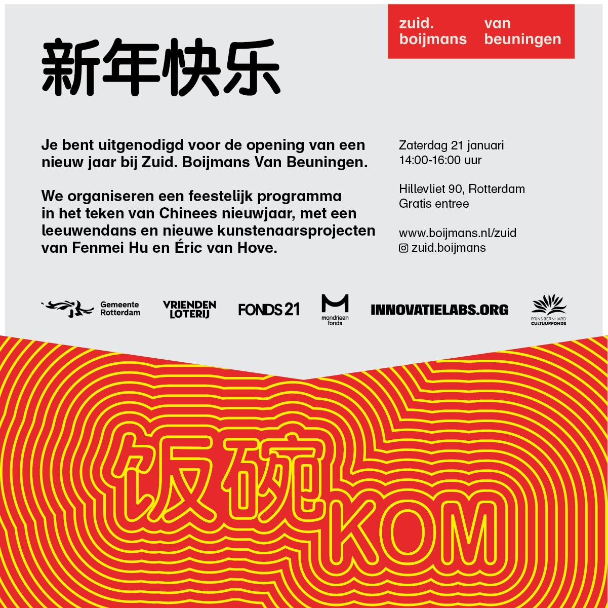 Graag willen we je van harte uitnodigen om samen met ons op 21 januari het programmajaar te openen bij Zuid. Boijmans. Er staat een feestelijk programma op de planning in het teken van Chinees Nieuwjaar, met nieuwe kunstenaarsprojecten van Fenmei Hu en Éric van Hove. Zien we je die dag op de Hillevliet? Onderstaand vind je de uitnodiging met meer informatie.